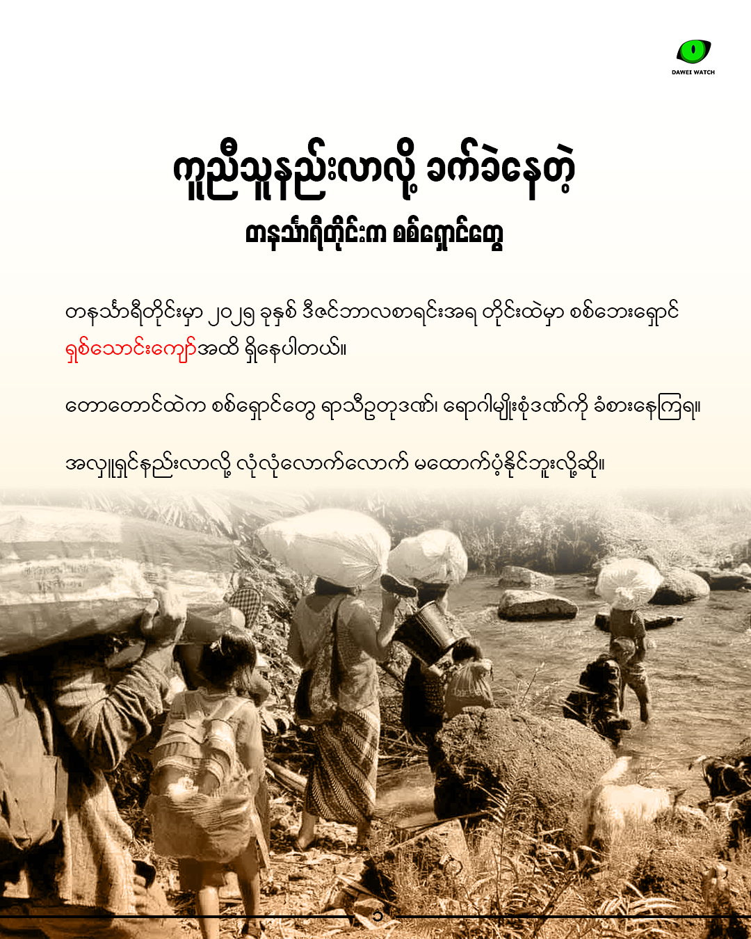 တနင်္သာရီတိုင်းမှာ တိုက်ပွဲနဲ့ လေကြောင်းတိုက်ခိုက်တာတွေကြောင့် နေရပ်စွန့်ခွာထွက်ပြေးရသူ စစ်ဘေးရှောင်အရေအတွက်ကလည်း ပိုများလာပါတယ်။ ပြီးခဲ့တဲ့ ဒီဇင်ဘာလစာရင်းအရ တိုင်းထဲမှာ စစ်ဘေးရှောင် ရှစ်သောင်းကျော်အထိ ရှိနေပါတယ်။ ဒီလိုအခြေအနေမှာ အလှူရှင်တွေကလည်း နည်းလာနေလို့ စစ်ဘေးရှောင်ကူညီရေးအဖွဲ့တွေအနေနဲ့ လုံလုံလောက်လောက် မထောက်ပံ့နိုင်ဖြစ်နေတယ်လို့ဆိုပါတယ်။