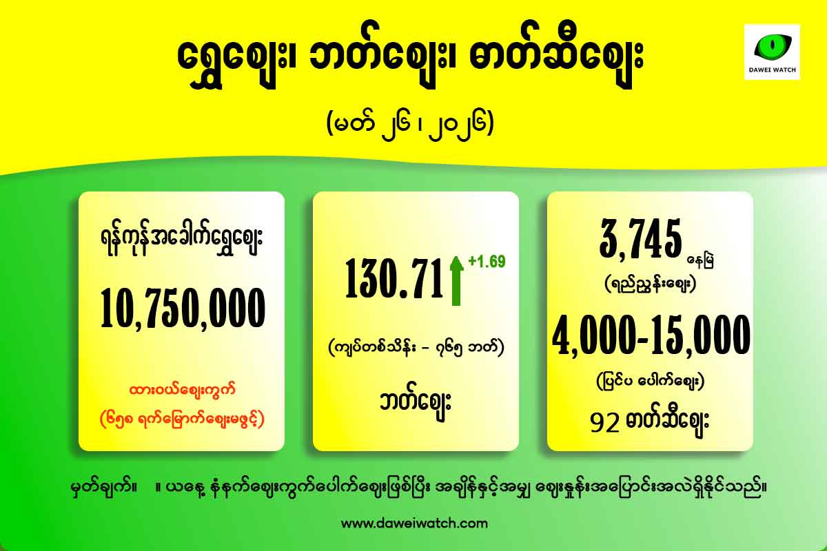 ရန်ကုန်-ထားဝယ် လေးယောက်စီး အိမ်စီးကားခမှာ စျေးနှစ်ဆနီးပါးမြင့်တက်လာပြီး ခရီးစဉ်တစ်ကြောင်းလျှင် ကျပ်နှစ်သိန်းခွဲမှ သုံးသိန်းကြားအထိ စျေးပေးရကြောင်း ခရီးသည်များနှင့် ယာဉ်ပိုင်ရှင်များထံမှ သိရသည်။ မတ်လတတိယပတ်အထိ ခရီးသည်တစ်ဦးလျှင် ကျပ်တစ်သိန်းခွဲသာရှိရာမှ မတ်လ နောက်ဆုံးပတ်အတွင်း ယင်းသို့စျေးတက်လာကြောင်း ရန်ကုန်-ထားဝယ် လေးယောက်စီးကား ပြေးဆွဲနေသူ ယာဉ်မောင်းအမျိုးသားတစ်ဦးက ပြောသည်။ စက်သုံးဆီစျေးတက်ခြင်းနှင့် ဆီဝယ်ယူရခက်ခဲခြင်းတို့ကြောင့် စျေးတက်လာခြင်းဖြစ်ကြောင်း ၎င်းက ဆိုသည်။ “ရေးနဲ့ မော်လမြိုင်ကြားမှာဆိုရင် အခု အချိန်ကန့်သတ်ချက်ကြောင့် ကျွန်တော်တို့ ရောက်တဲ့အချိန် ဆီတန်းစီလို့ မရဘူး။ တော်တော်အခက်အခဲဖြစ်တယ်။ အပြင်စျေးနဲ့ ဝယ်ရတော့ ဆီဖိုးလည်း နှစ်ဆကျော်လောက်ကုန်တယ်” ဟု အထက်ပါ ယာဉ်မောင်းအမျိုးသားက ပြောဆိုသည်။ ဆီတန်းစီရသည့်အတွက် အချိန်ကြာမြင့်ခြင်းကြောင့် ယခုနောက်ပိုင်း လေးယောက်စီး ကားငယ်အချို့မှာ ရန်ကုန်အဝင် နောက်ကျပြီး အဆင်းကားအချို့မှာလည်း လမ်းခရီးတွင် ညအိပ်ရသည်အထိ ကြန့်ကြာမှုများ […]