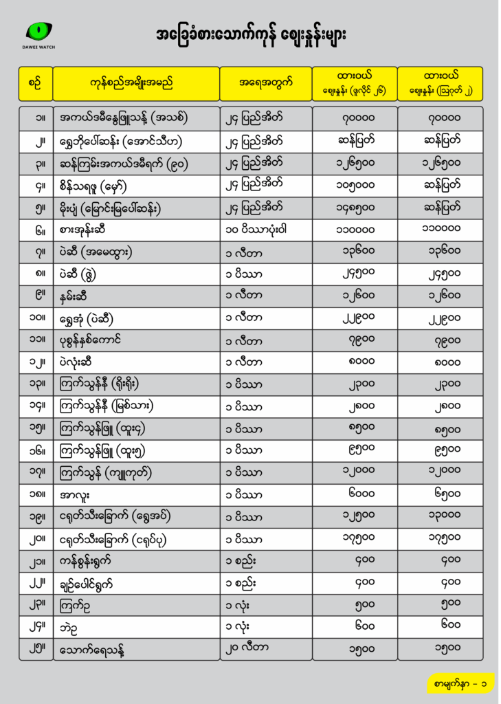 ထားဝယ်ရေထွက်ကုန်ဈေးကွက်တွင် လူအများစားသုံးလေ့ရှိသည့် ရေထွက်ကုန်အချို့ ယခုသီတင်းပတ်အတွင်း ဈေးတက်လာသည်။