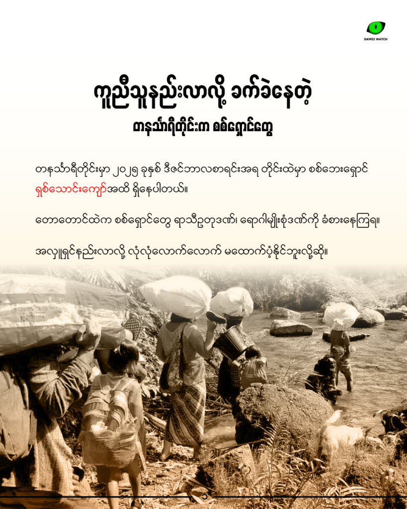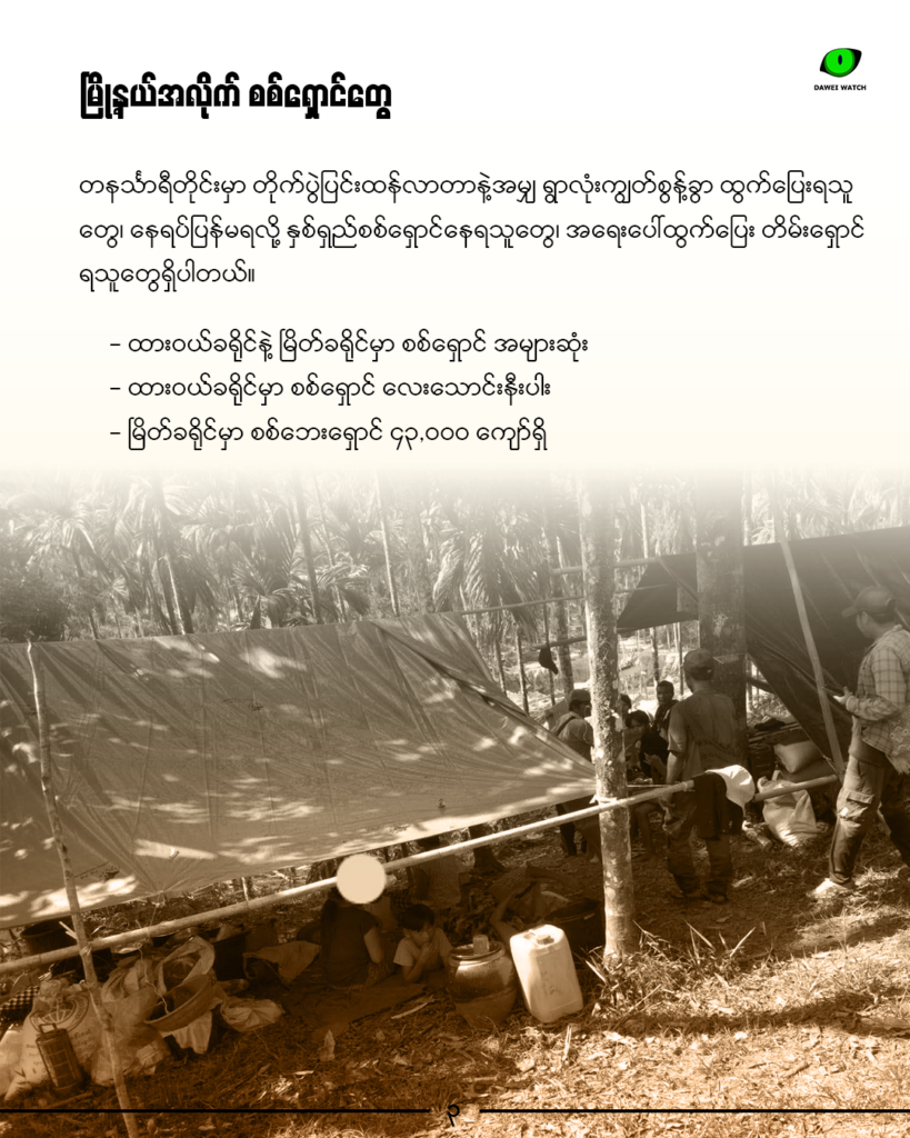 တနင်္သာရီတိုင်းမှာ တိုက်ပွဲနဲ့ လေကြောင်းတိုက်ခိုက်တာတွေကြောင့် နေရပ်စွန့်ခွာထွက်ပြေးရသူ စစ်ဘေးရှောင်အရေအတွက်ကလည်း ပိုများလာပါတယ်။ ပြီးခဲ့တဲ့ ဒီဇင်ဘာလစာရင်းအရ တိုင်းထဲမှာ စစ်ဘေးရှောင် ရှစ်သောင်းကျော်အထိ ရှိနေပါတယ်။