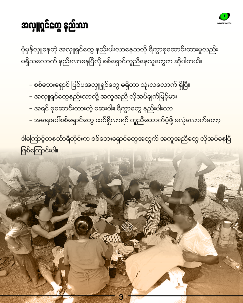 ဒီလိုအခြေအနေမှာ အလှူရှင်တွေကလည်း နည်းလာနေလို့ စစ်ဘေးရှောင်ကူညီရေးအဖွဲ့တွေအနေနဲ့ လုံလုံလောက်လောက် မထောက်ပံ့နိုင်ဖြစ်နေတယ်လို့ဆိုပါတယ်။