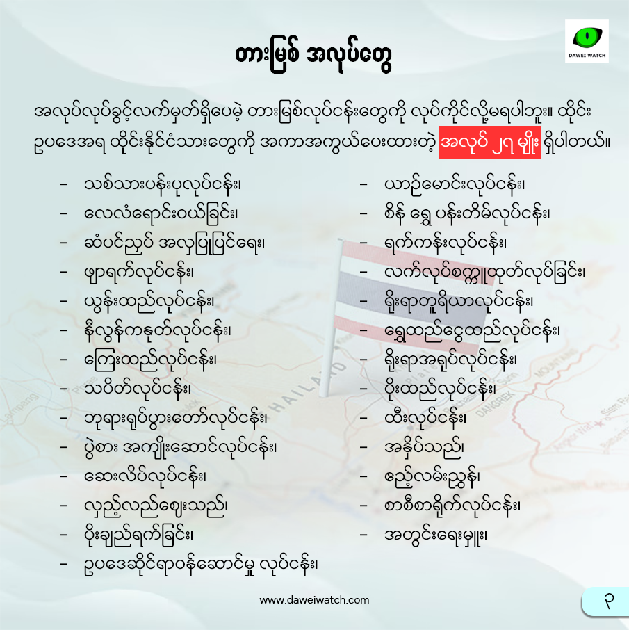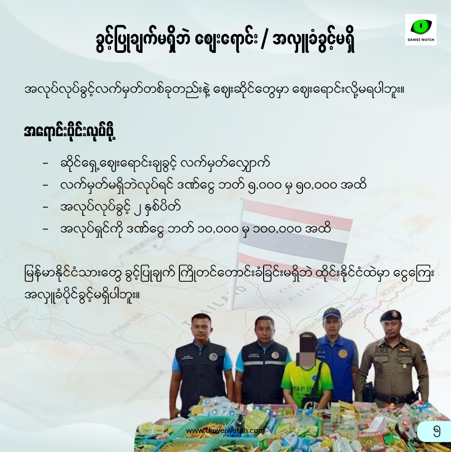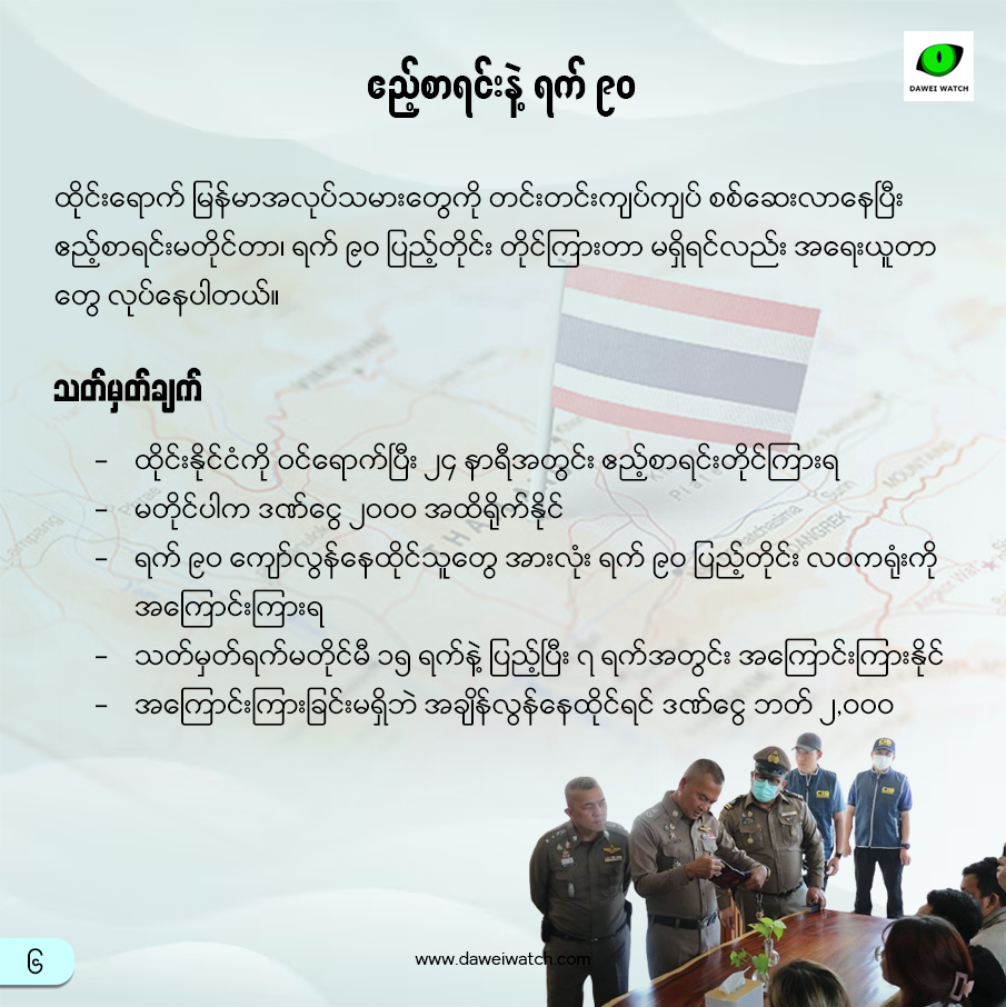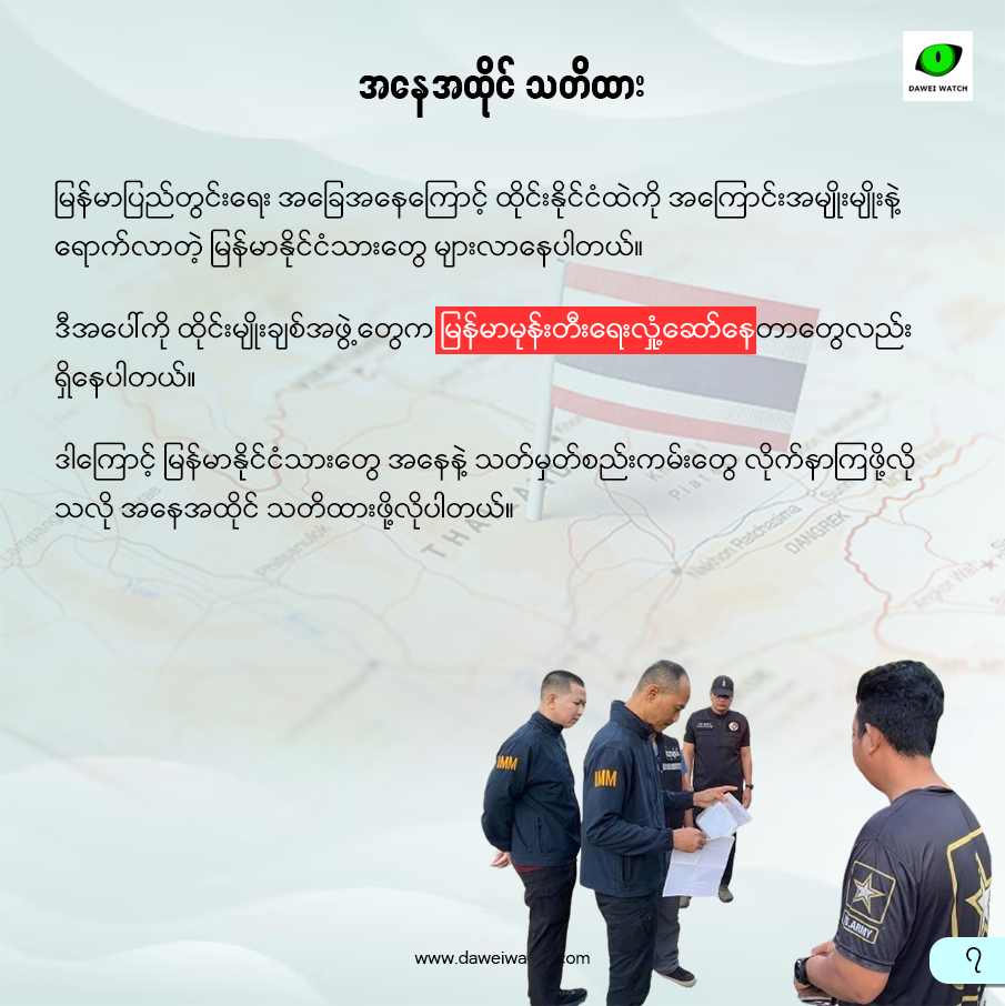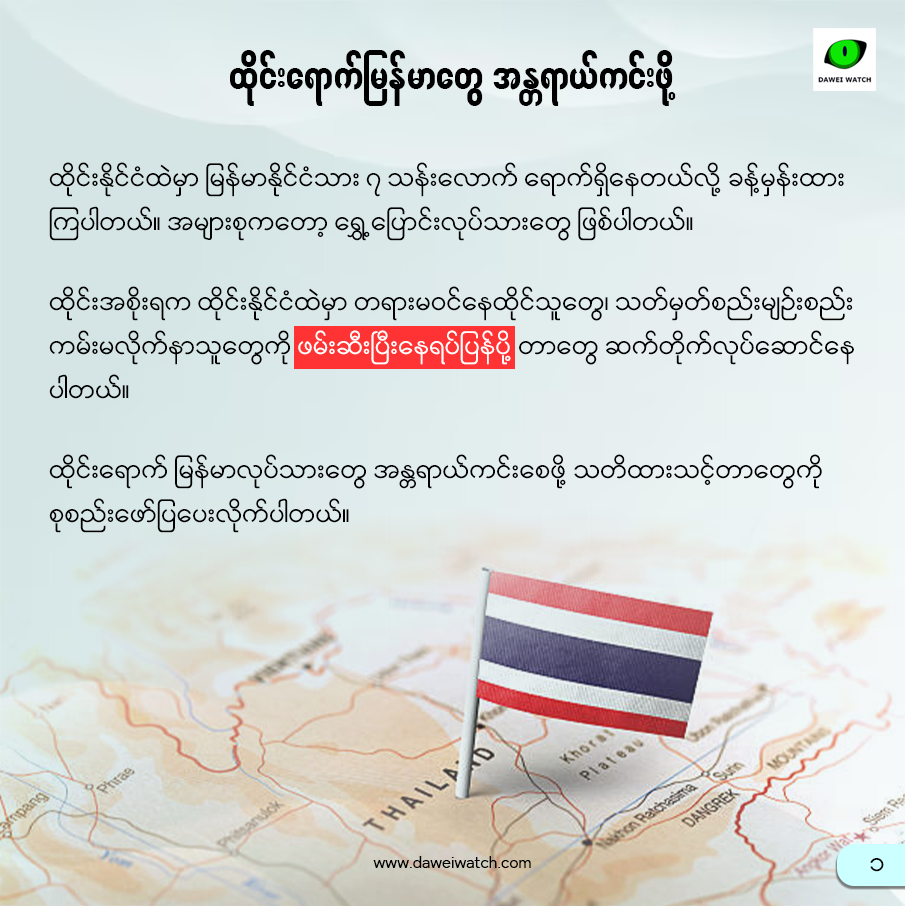 ထိုင်းအစိုးရက ထိုင်းနိုင်ငံထဲမှာ တရားမဝင်နေထိုင်သူတွေ၊ သတ်မှတ်စည်းမျဉ်းစည်းကမ်း မလိုက်နာသူတွေကို ဖမ်းဆီးပြီး နေရပ်ပြန်ပို့တာတွေ ဆက်တိုက်လုပ်ဆောင်နေတာကြောင့် ထိုင်းရောက် မြန်မာလုပ်သားတွေ အန္တရာယ်ကင်းစေဖို့ သတိထားသင့်တာတွေကို စုစည်းဖော်ပြပေးလိုက်ပါတယ်။