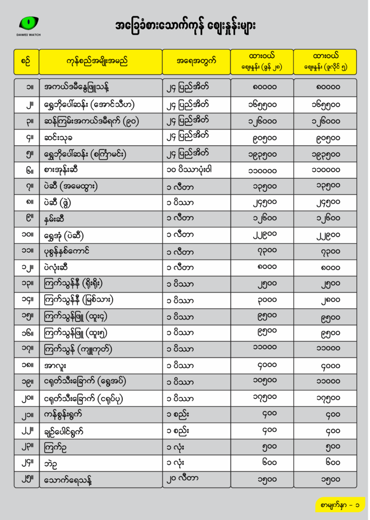 ပြီးခဲ့သည့် သီတင်းပတ်ဖြစ်သည့် ဇွန်လ ၂၈ရက်တွင် ရွှေအပ်ငရုတ်ခြောက်တစ်ပိဿာ ၁၀၅၀၀ကျပ်ရှိရာမှ ဇူလိုင်လ ၅ ရက်တွင်မူ တစ်ပိဿာ ၁၁၀၀၀ကျပ် ဖြစ်သွားသည်။
