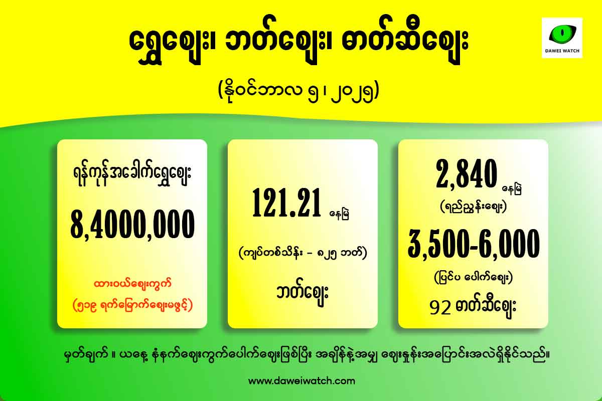 ဓာတ်ဆီဈေးမှာ ရည်ညွှန်းဈေးနှုန်းအပြင် မြေပြင်တွင် အမှန်တစ်ကယ် ဝယ်ယူသုံးစွဲရသည့် ပြင်ပဈေးကွက်ပေါက်ဈေးကိုပါ ပူးတွဲဖော်ပြအပ်ပါသည်။