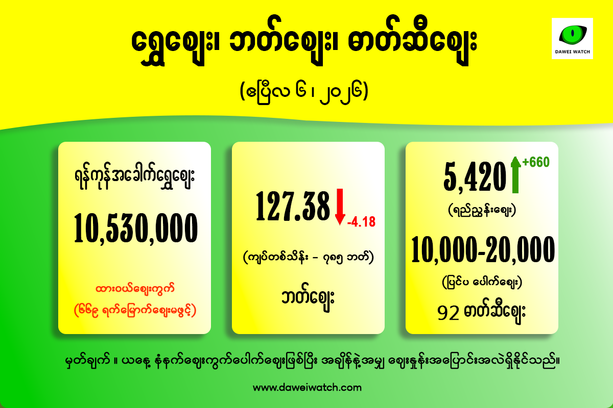 ရန်ကုန်ဈေးကွက်တွင် အခေါက်ရွှေတစ်ကျပ်သားလျှင် 10530000 ကျပ် ဈေးဖွင့်ထားသည်။