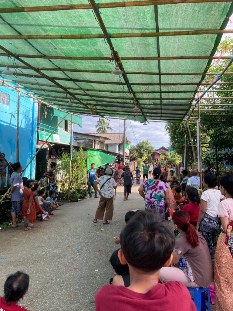 ညနေပိုင်း၌ ရပ်ကွက်အချို့ တွင်လည်း ပျော်ပွဲရွှင်ပွဲ များပြုလုပ်နေသည်ကိုတွေ့ရသည် ။