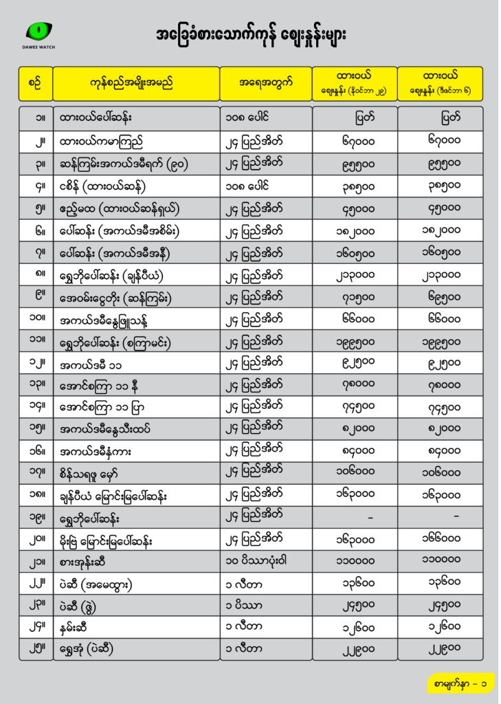 အခြားဆန်အမျိုးအစားအချို့မှာမူ ဇယားပါဈေးနှုန်းများအတိုင်း ဈေးငြိမ်နေသည်ကို တွေ့ရသည်။