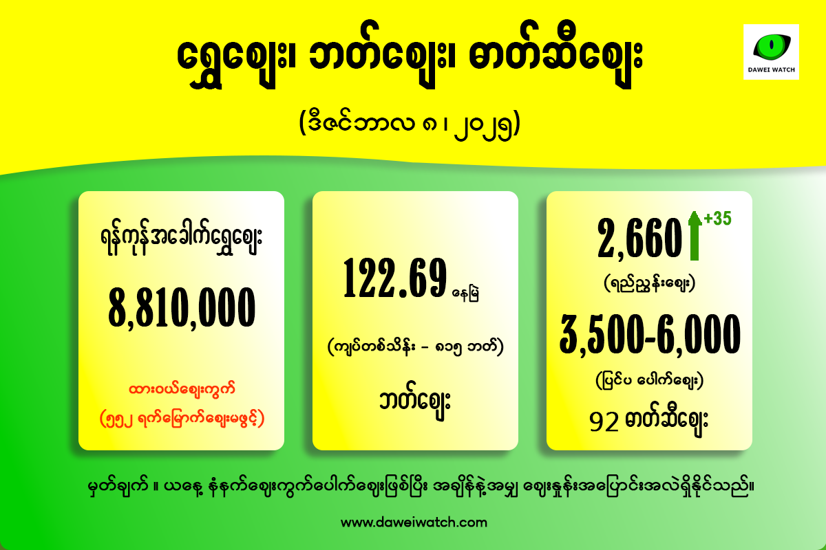 ရန်ကုန်ဈေးကွက်တွင် အခေါက်ရွှေတစ်ကျပ်သားလျှင် 8810000 ကျပ် ဈေးဖွင့်ထားသည်။