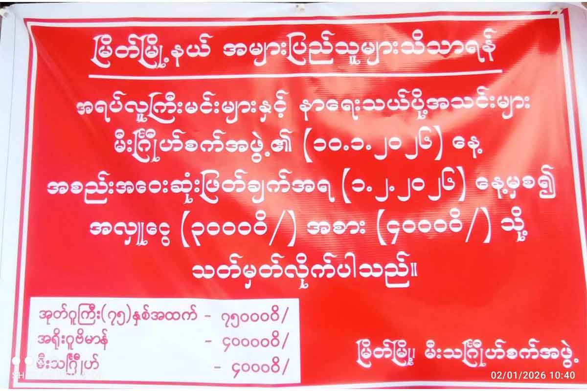 မြိတ်မြို့တွင် မီးသင်္ဂြိုဟ်စရိတ်ကို ဖေဖော်ဝါရီလ ၁ ရက်ကစပြီး ကျပ်လေးသောင်း ကောက်ခံမည်ဖြစ်ကြောင်း မြိတ်မြို့ မီးသင်္ဂြိုဟ်နာရေးအသင်းထံမှ သိရသည်။