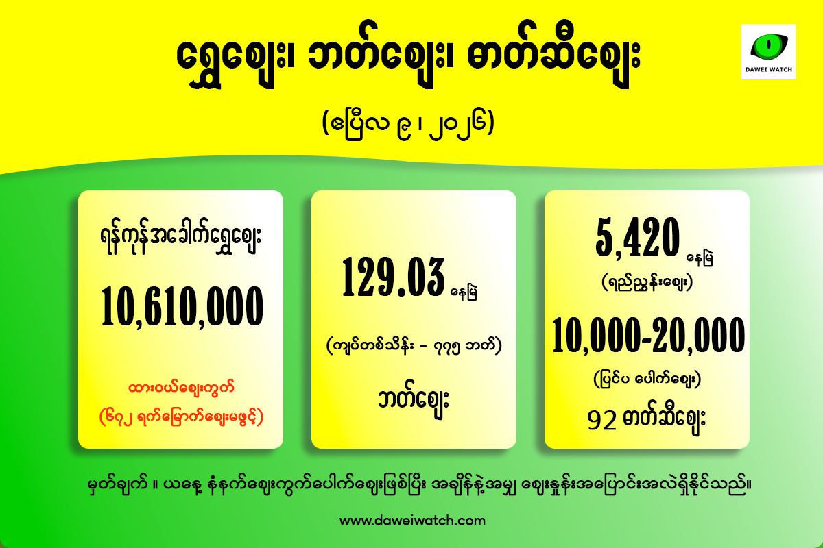 ဓာတ်ဆီဈေးမှာ ရည်ညွှန်းဈေးနှုန်းအပြင် မြေပြင်တွင် အမှန်တစ်ကယ် ဝယ်ယူသုံးစွဲရသည့် ပြင်ပဈေးကွက်ပေါက်ဈေးကိုပါ ပူးတွဲဖော်ပြအပ်ပါသည်။