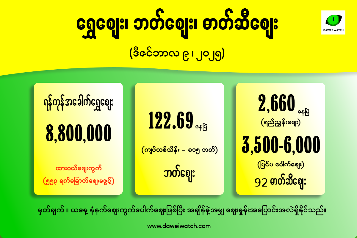 ဓာတ်ဆီဈေးမှာ ရည်ညွှန်းဈေးနှုန်းအပြင် မြေပြင်တွင် အမှန်တစ်ကယ် ဝယ်ယူသုံးစွဲရသည့် ပြင်ပဈေးကွက်ပေါက်ဈေးကိုပါ ပူးတွဲဖော်ပြအပ်ပါသည်။