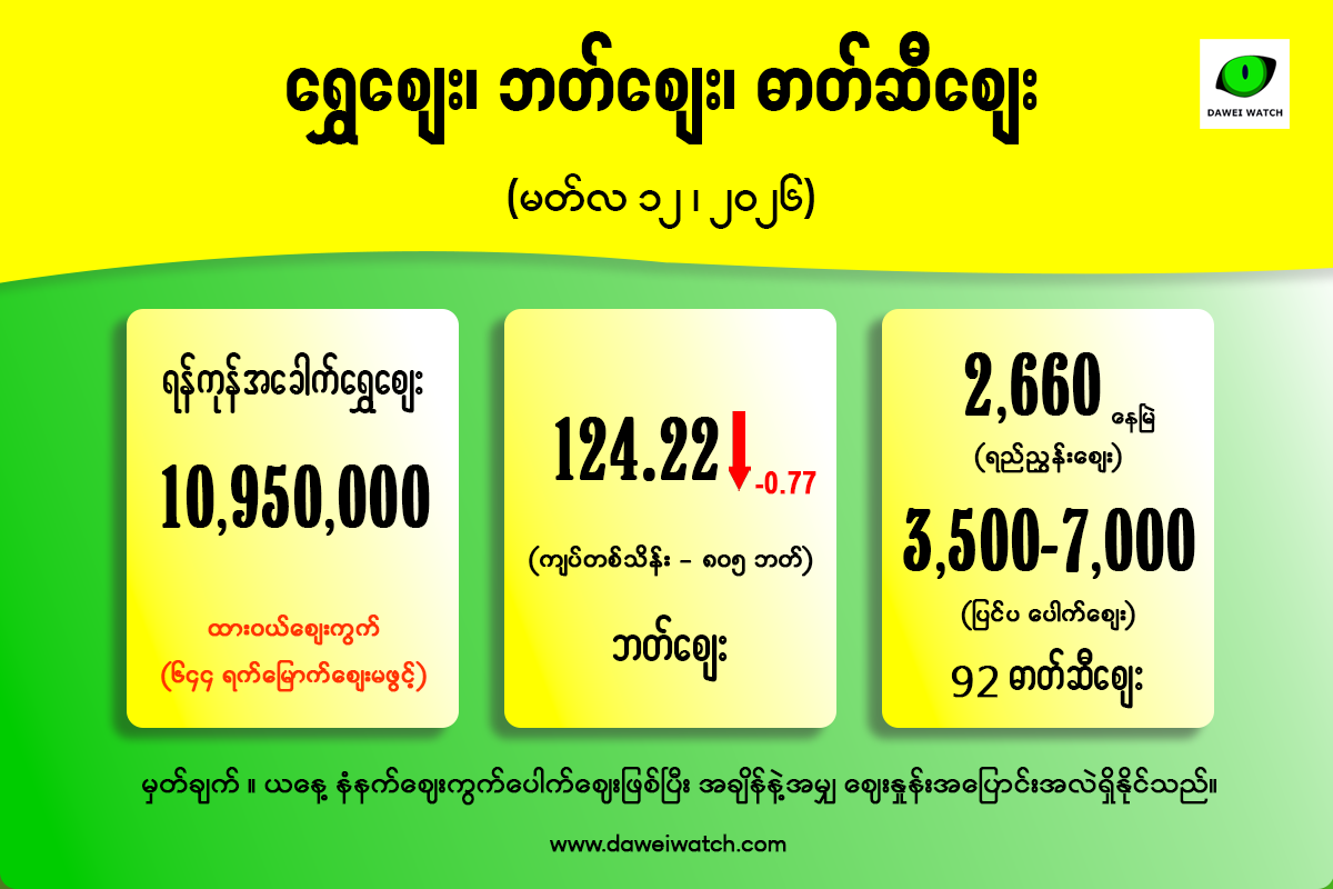 ထိုကြောင့် ထားဝယ်ဈေးကွက်တွင် အခေါက်ရွှေဈေးမဖွင့်တော့ဘဲ ရန်ကုန်ဈေးကွက်ကို အခြေခံကာ ကြိုက်ရောင်းကြိုက်ဝယ် ဖြစ်နေသည်။