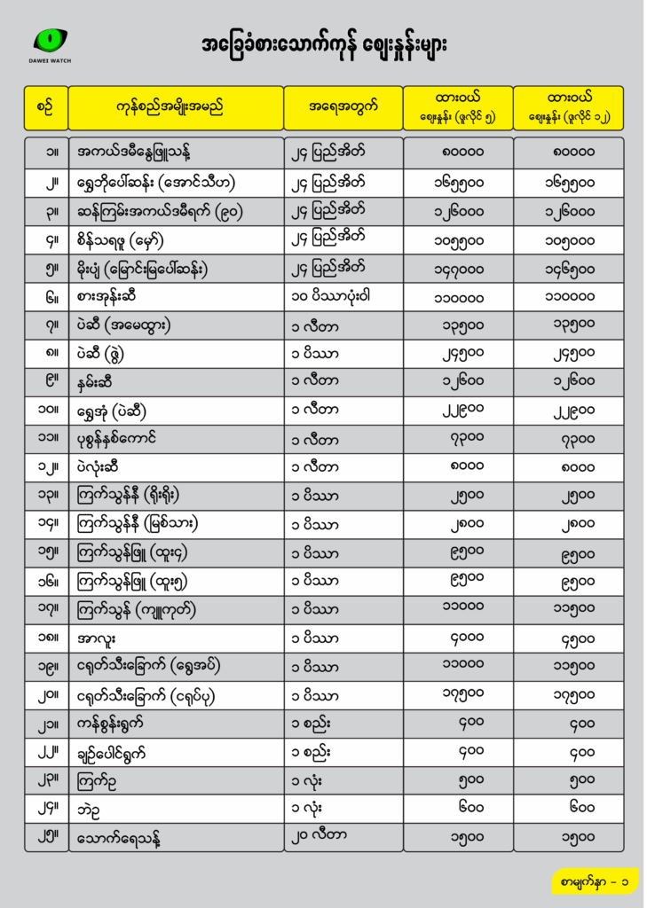 ထားဝယ်ဈေးကွက်တွင် ယခုသီတင်းပတ်အတွင်း ဆန်နှင့် ငရုတ်ဈေးကျပြီး ကြက်သွန်ဖြူ (ကြူကုတ်) ဈေးတက်လာသည်။