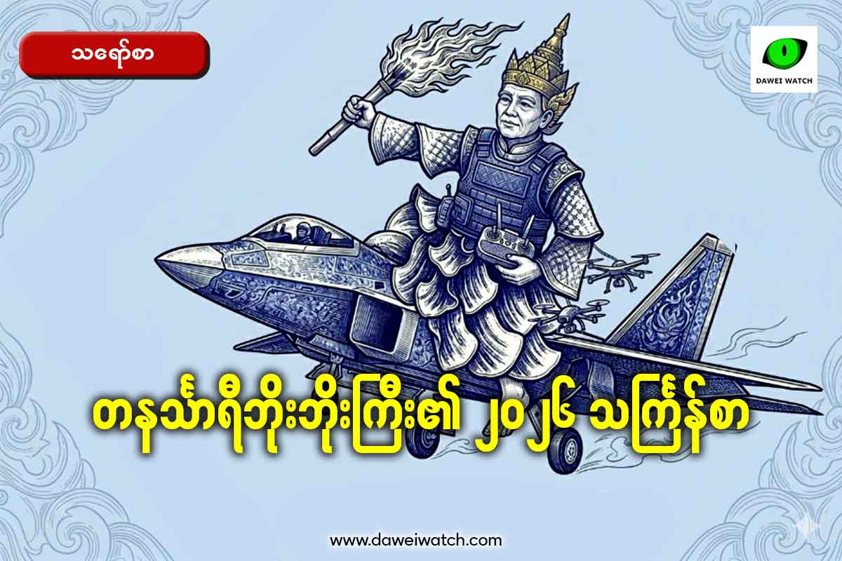 တနင်္သာရီဘိုးဘိုးကြီးသည် ကျည်ကာဝတ်ရုံတော်ခြုံလျက် တိုက်လေယာဉ်ပျံစီးကာ ညာဘက်လက်က မီးတုတ်ကိုင်ပြီး ဘယ်ဘက်လက်က ဒရုန်းကွန်ထရိုးကိုင်လျက် ဆင်းအံ့။