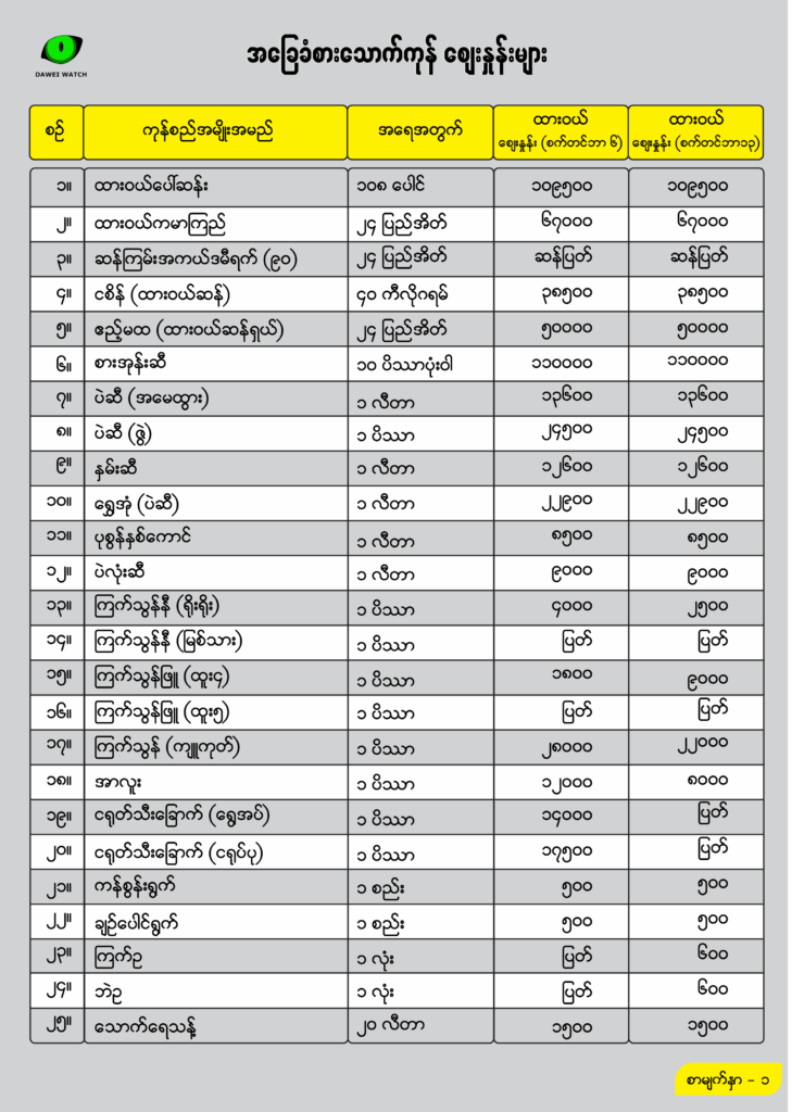 ထားဝယ်ရေထွက်ကုန်ဈေးတွင်မူ ငါးနှင့်ပုစွန်ဈေးနှုန်းများ မြင့်တက်နေသည်ကို ဇယားပါအတိုင်းတွေ့ရှိရမည်ဖြစ်သည်။