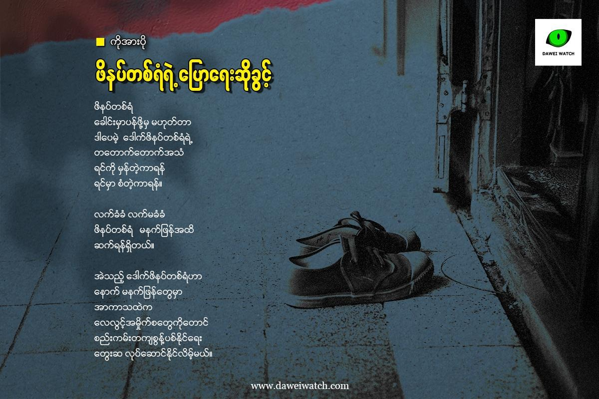 အဲဒီအတွက် ဖိနပ်တစ်ရံရဲ့ ပြောရေးဆိုခွင့်ရှိတာကိုလည်း ခပ်ရဲရဲပြောချင်တာပါ။ ဖိနပ်ချင်းအတူတူ အသက်ပြင်းပြင်းရှုနေကြရတာရှိတယ်။ လက်အချင်းချင်းကူနေရတာရှိတယ်။ ရမက်ပြင်းပြင်း ပူနေကြတာရှိတယ်။ ဖိနပ်တစ်ရံနဲ့ပါတ်သတ်လို့ ကဗျာတိုလေးတစ်ပိုဒ်ရေးဦးမယ်။