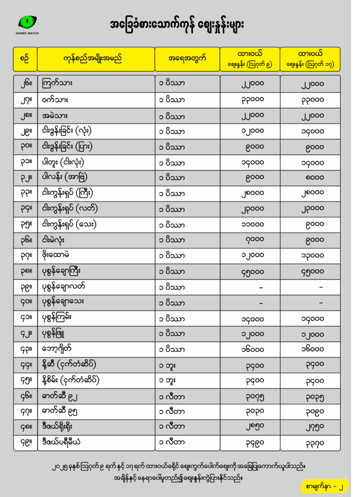 ပြီးခဲ့သည့်သီတင်းပတ်ဖြစ်သည့် ဩဂုတ်လ ၉ ရက်နေ့က ထားဝယ်ဆန်ရှည်(ဧည့်မထ) အမျိုးအစား ဆန်တစ်အိတ်လျှင် ၄၄၀၀၀ ကျပ်သာရှိရာမှ ယခုသီတင်းပတ်ဖြစ်သည့် ဩဂုတ်လ ၁၆ ရက်နေ့တွင်မူ တစ်အိတ်လျှင် ၅၀၀၀၀ ကျပ်ဖြစ်သွားသည်။