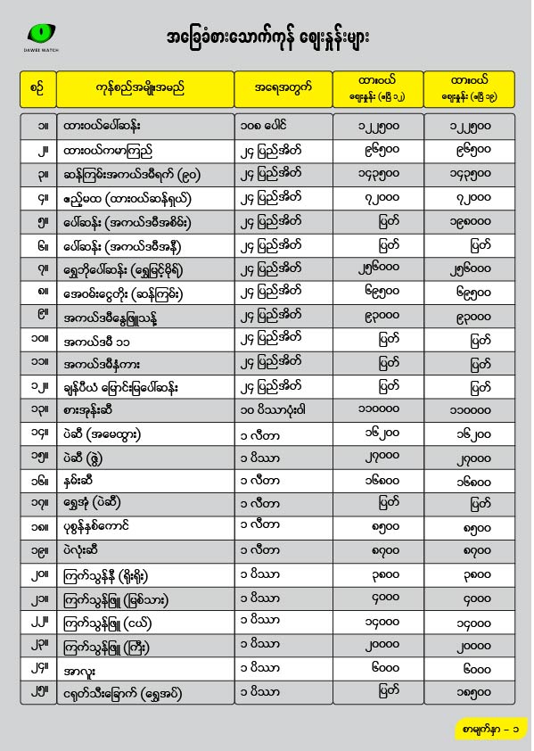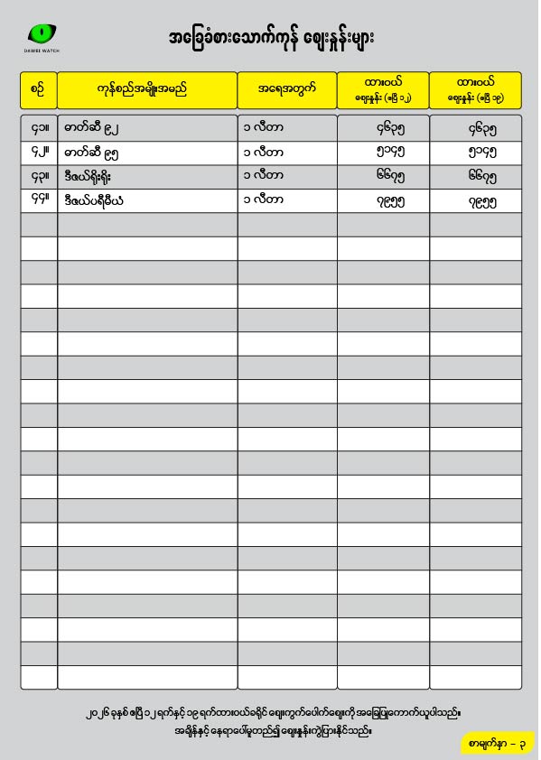 ထားဝယ်မြို့၏ အခြေခံစားသုံးကုန်ဈေးကွက်တွင် ယခုသီတင်းပတ်၌ ဆန်နှင့် စားဖိုဆောင်သီးနှံများမှာ ဇယားပါ ဈေးနှုန်းများအတိုင်း ဈေးငြိမ်နေသည်ကို တွေ့ရှိရမည်ဖြစ်သည်။