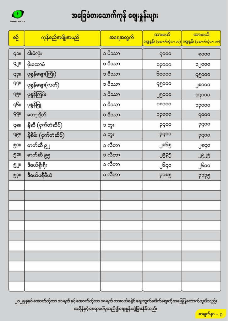 ထားဝယ်ဆန်နှင့် အခြားရန်ကုန်ဆန်အမျိုးအစားအများစုမှာ ဇယားပါဈေးနှုန်းများအတိုင်း ဈေးငြိမ်နေသည်ကို တွေ့ရှိရမည်ဖြစ်သည်။