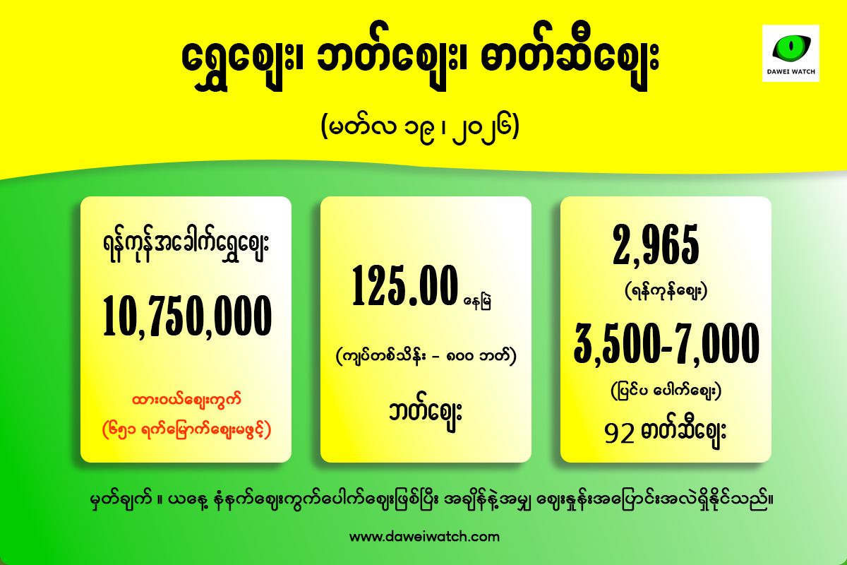 ဓာတ်ဆီဈေးမှာ ရည်ညွှန်းဈေးနှုန်းအပြင် မြေပြင်တွင် အမှန်တစ်ကယ် ဝယ်ယူသုံးစွဲရသည့် ပြင်ပဈေးကွက်ပေါက်ဈေးကိုပါ ပူးတွဲဖော်ပြအပ်ပါသည်။