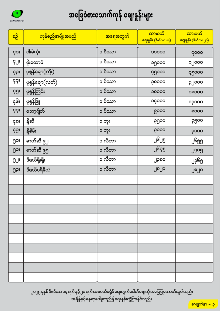 ပြီးခဲ့သည့် သီတင်းပတ်က ထားဝယ်ဈေးကွက်၌ ငါးကွမ်းရှပ် (လတ်) တစ်ပိဿာ ၂၃၀၀၀ကျပ်စျေးရှိရာမှ ဒီဇင်ဘာလ ၂၀ ရက်တွင် ၂၈၀၀၀ကျပ်သို့ ဈေးတက်သွားသည်ကို တွေ့ရသည်။