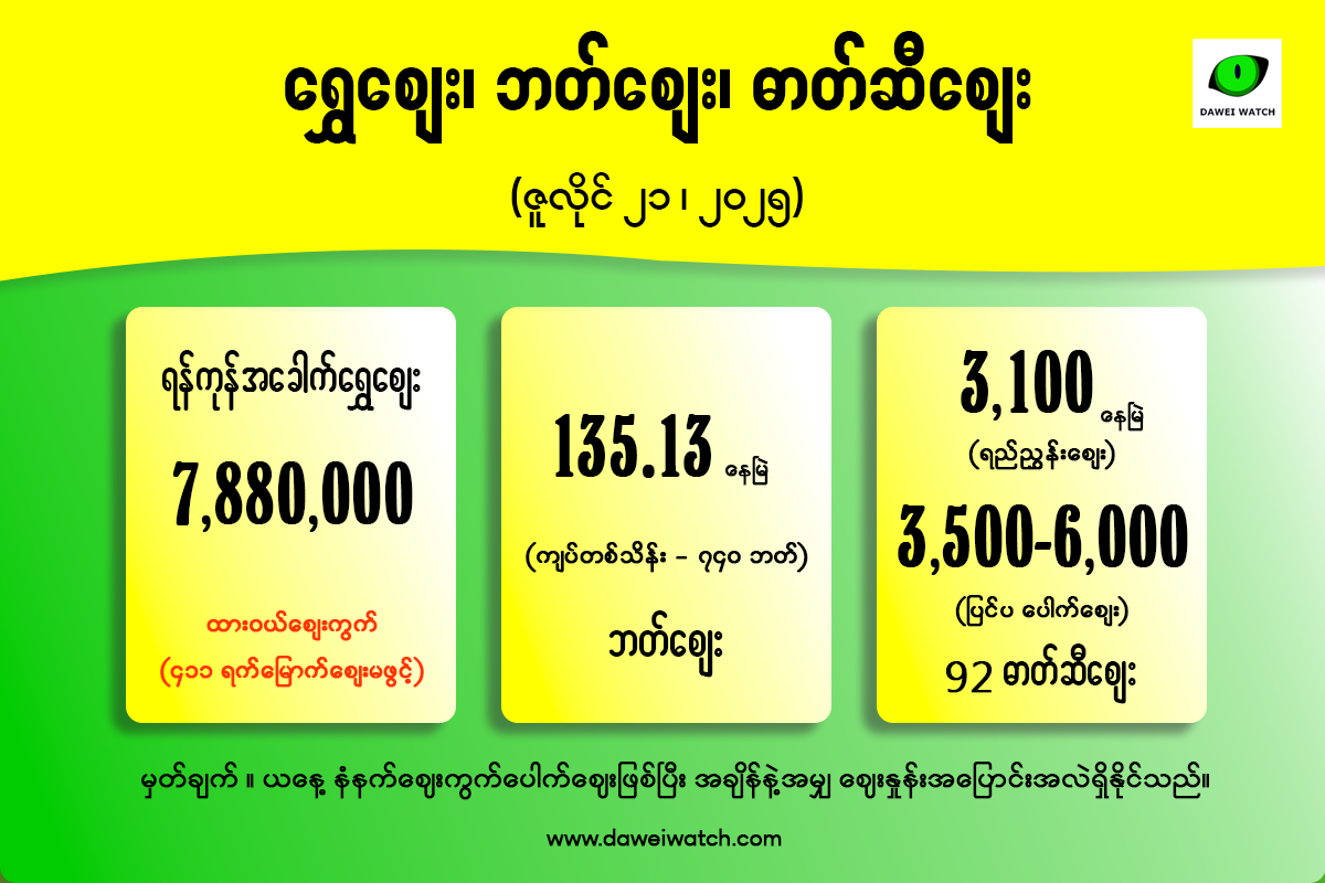 ရန်ကုန်ဈေးကွက်တွင် အခေါက်ရွှေတစ်ကျပ်သားလျှင် ၇,၈၈၀,၀၀၀ ကျပ် ဈေးဖွင့်ထားသည်။