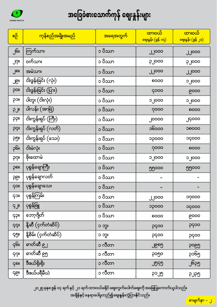 ကြက်သွန်နီတစ်ပိဿာ ၂၅၀၀ ကျပ်ဖြင့် မေလ ၁၇ ရက်မှစပြီး ခြောက်ပတ်ဆက်တိုက် ဈေးငြိမ်နေသလို ကြက်သွန်ဖြူ ထူး ၅ မှာလည်း တစ်ပိဿာ ၉၅၀၀ကျပ်ဖြင့် ဇွန်လ ၁၄ ရက်မှစ၍ နှစ်ပတ်ဆက်တိုက်ဈေးငြိမ်လျက်ရှိသည်။