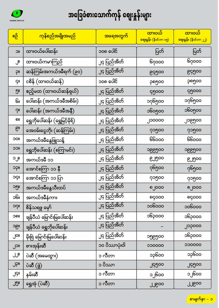 ပြီးခဲ့သည့်သီတင်းပတ်ဖြစ်သည့် နိုဝင်ဘာလ ၁၆ ရက်နေ့က ထားဝယ်ဈေးကွက်တွင် ရွှေအပ်ငရုတ်သီးခြောက်တစ်ပိဿာ ၁၆၅၀၀ ကျပ်မှ နိဝင်ဘာလ ၂၃ ရက်နေ့တွင် တစ်ပိဿာ ၁၇၅၀၀ ကျပ် ဖြစ်သွားသည်။