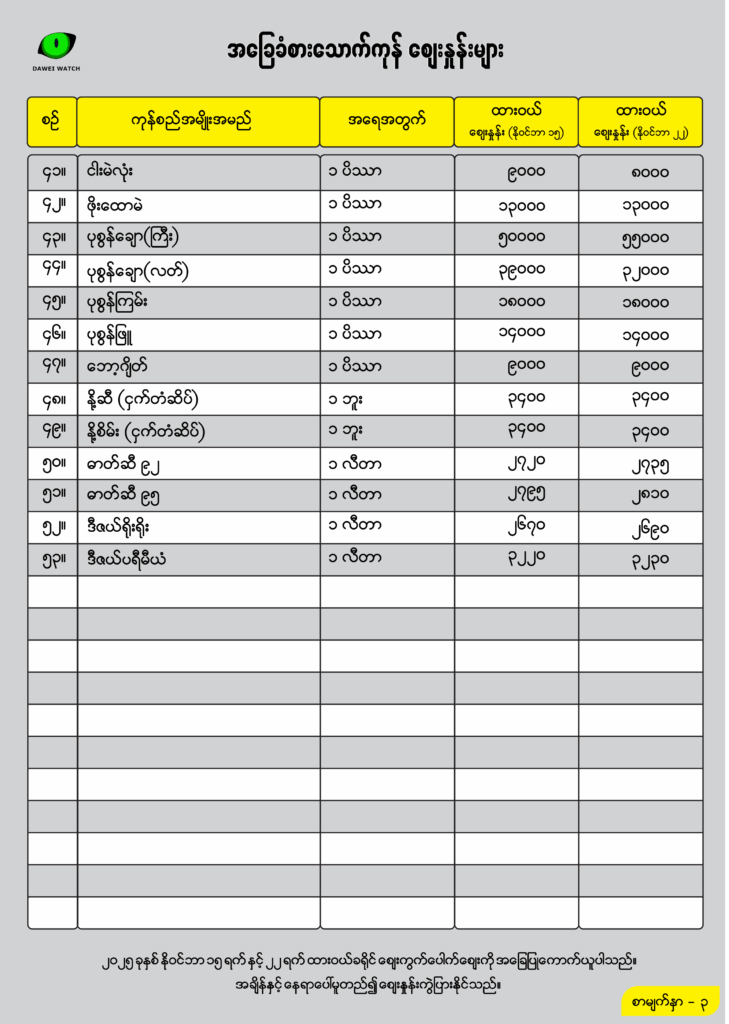 ပြီးခဲ့သည့်သီတင်းပတ်ဖြစ်သည့် နိုဝင်ဘာလ ၁၆ ရက်နေ့တွင် ထားဝယ်ဈေးကွက်၌ ကြက်သွန်ဖြူ ထူး ၄ တစ်ပိဿာ ၉၅၀၀ ကျပ်မှ ယခုသီတင်းပတ်ဖြစ်သည့် နိုဝင်ဘာ ၂၃ ရက်နေ့တွင် တစ်ပိဿာ ၈၅၀၀ကျပ်၊ကြက်သွန်ဖြူထူး ၅ တစ်ပိဿာ ၁၀၀၀၀ ကျပ်မှ ၉၅၀၀ ကျပ်သို့ ဈေးကျသွားခြင်းဖြစ်သည်။