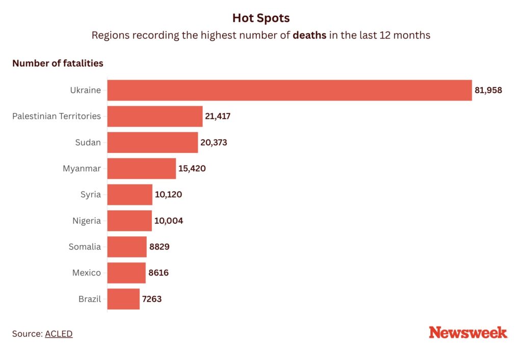 ပြီးခဲ့တဲ့ ၁၂လတာကာလအတွင်း မြန်မာနိုင်ငံမှာ လူတစ်သောင်းခွဲကျော် သေဆုံးခဲ့တယ်လို့ ဖော်ပြပါတယ်။ ပဋိပက္ခကြောင့် လူသေဆုံးမှု အများဆုံး ကမ္ဘာနိုင်ငံစာရင်းမှာ ရုရှားနဲ့ စစ်ဖြစ်နေတဲ့ ယူကရိန်းက ထိပ်ဆုံးမှာ ရှိနေပြီး သူ့နောက်မှာ ပါလက်စတိုင်းနဲ့ ဆူတန်တို့ ရှိနေပါတယ်။