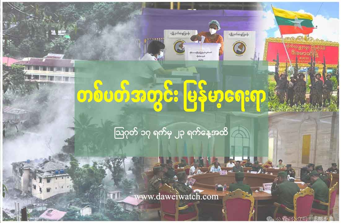 အပိုင်း (၁) ကျင်းပဖို့ စီစဉ်ရာမှာ မကြာသေးခင်က သိမ်းယူထားတဲ့ ရှမ်းမြောက်က နောင်ချိုနဲ့ ကိုးကန့်တပ် ပြန်ပေးခဲ့တဲ့ လားရှိုးကိုလည်း ထည့်သွင်းထားတာတွေ့ရပါတယ်။ စစ်ကော်မရှင်က ထိန်းချုပ်မြို့တွေမှာ ရွေးကောက်ပွဲကျင်းပဖို့ ကြိုးပမ်း နေသလို လက်လွှတ်ဆုံးရှုံး ထားရတဲ့ မြို့နယ်တွေကို တန်ပြန်ထိုးစစ်တွေ အရှိန်မြှင့်လုပ်ဆောင်နေတာ တွေ့ရပါတယ်။