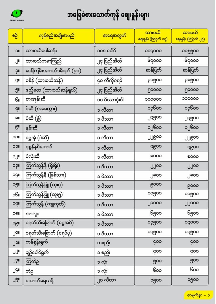 ထားဝယ်တွင် ယခုသီတင်းပတ်အတွင်း ထားဝယ်ပေါ်ဆန်းဆန်ဈေးတက်ပြီး ရေထွက်ကုန် ပစ္စည်းများ ဈေးကျလာသည်။