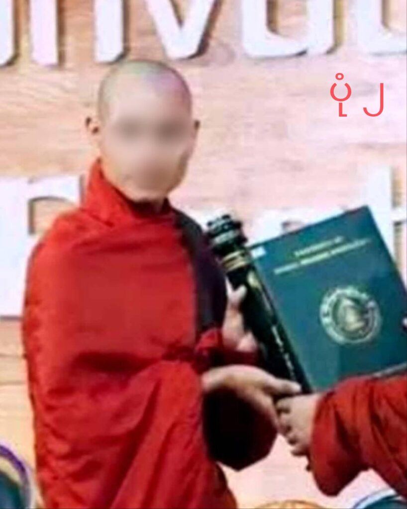 အဲဒီပျံ့နှံ့နေတဲ့ပုံမှာ ရဟန်းတစ်ပါးက ဘွဲ့နှင်းသဘင်တစ်ခုမှာ ဘွဲ့လက်မှတ်ယူနေတဲ့ပုံဖြစ်ပါတယ်။ အောက်ဖော်ပြပါ ပုံမှာ ကြည့်နိုင်ပါတယ်။