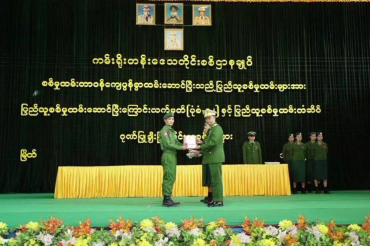 ကမ်းရိုးတန်းတိုင်းစစ်ဌာနချုပ်အခြေစိုက်ရာ မြိတ်မြို့တွင် ဧပြီလ ၁၁ ရက်က အပတ်စဥ် (၁) က စစ်မှုထမ်းအချို့အား စစ်မှုထမ်းပြီးစီးကြောင်း လက်မှတ်ပေးအပ်ကြောင်း စစ်အုပ်စုက သတင်းထုတ်ပြန်ပြီး အရေအတွက်ကိုမူ မဖော်ပြခဲ့ပေ။
