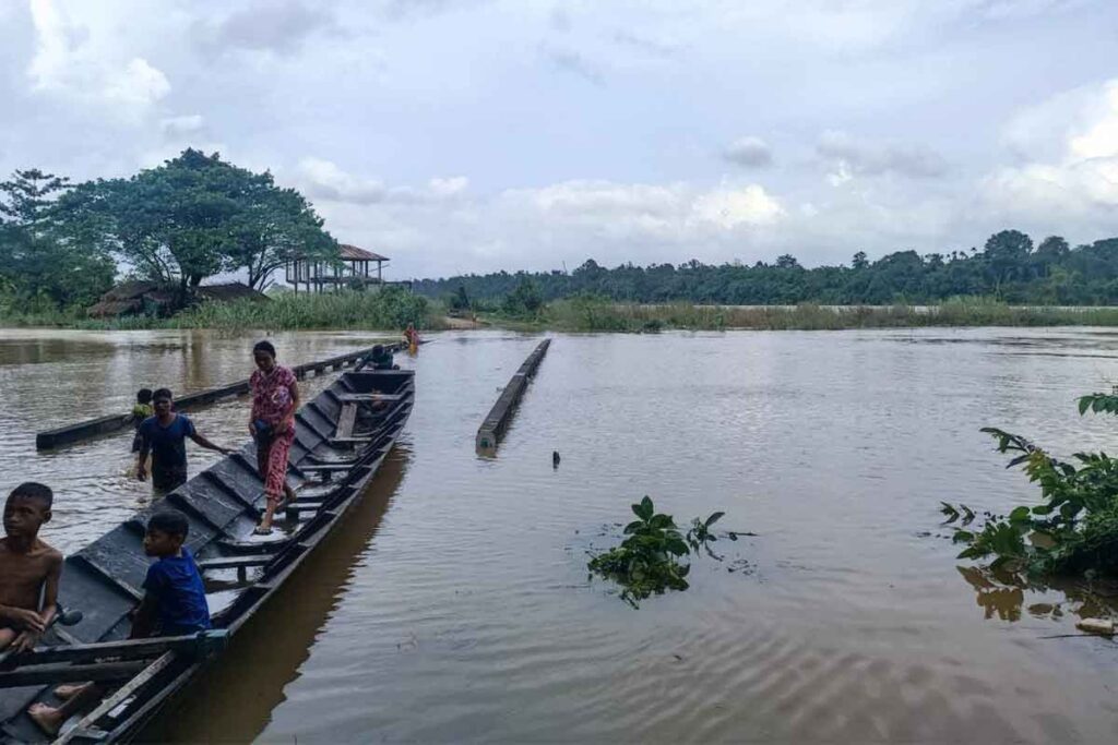 တံတားနှင့် လမ်းများ ရေမြုပ်နေသည့်အတွက် လှေဖြင့်သွားလာနေရကြောင်း ဒေသခံများထံမှ သိရသည်။