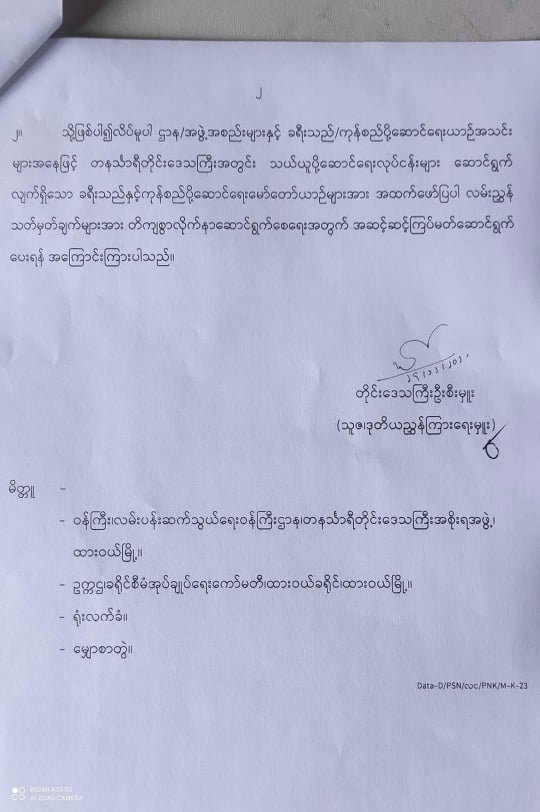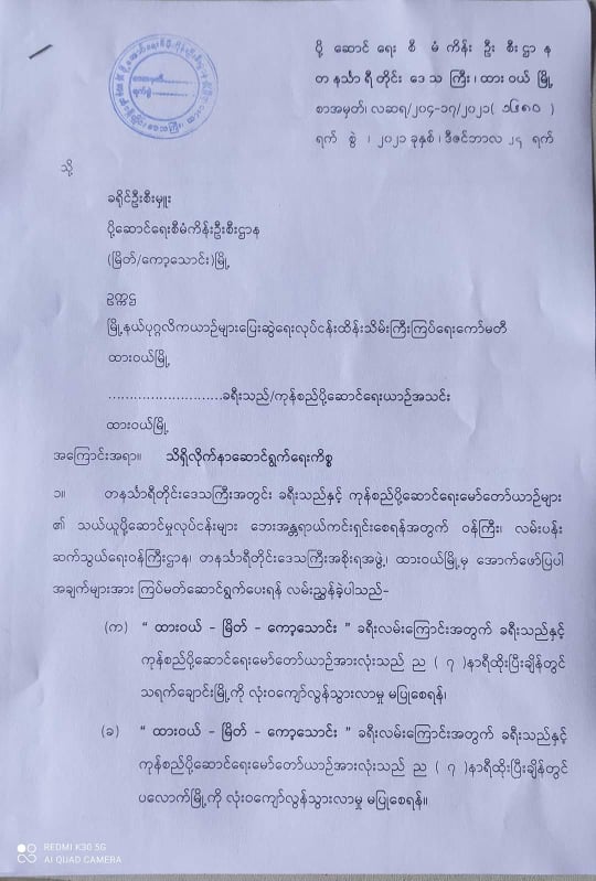 တိုင်းဒေသကြီး ပို့ဆောင်ရေးစီမံကိန်းဦးစီးဌာနကထုတ်ပြန်ထားသည့်စာ