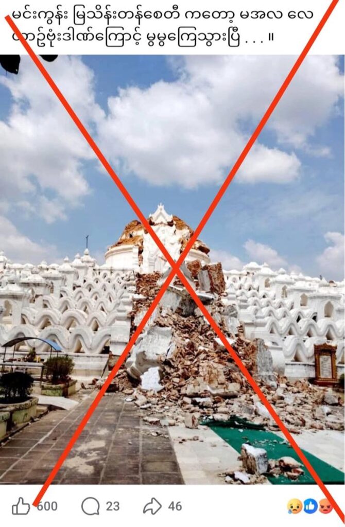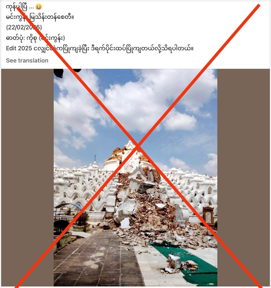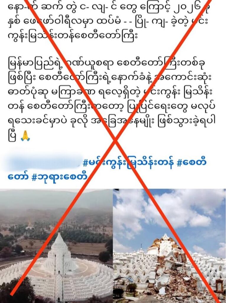 ဒါ့ကြောင့် မင်းကွန်း မြသိန်းတန်စေတီဟာ ဗုံးကြဲမှုနဲ့ နောက်ဆက်တွဲငလျင်ကြောင့် ထပ်ပြိုကျတာမဟုတ်ဘဲ ဓာတ်ပုံ အဟောင်း ပြန်လည်ပျံ့နှံ့တာနဲ့အတူ သတင်းအမှားတွေနဲ့ ယှဥ်တွဲပျံ့နှံ့ခဲ့တာအဖြစ် စိစစ်တွေ့ရှိရပါတယ်။