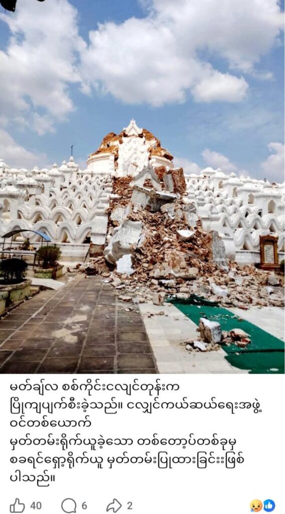 ငလျင်ကြောင့် သမိုင်းဝင် မြသိန်းတန်စေတီ ပျက်စီးတဲ့အကြောင်း Dawei Watch ကလည်း ၂၀၂၅ ခုနှစ် မတ်လ ၂၉ရက်က ဖော်ပြခဲ့သတင်းကို အောက်ဖော်ပြပါလင့်ခ်မှာ ကြည့်နိုင်ပါတယ်။