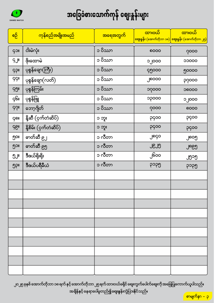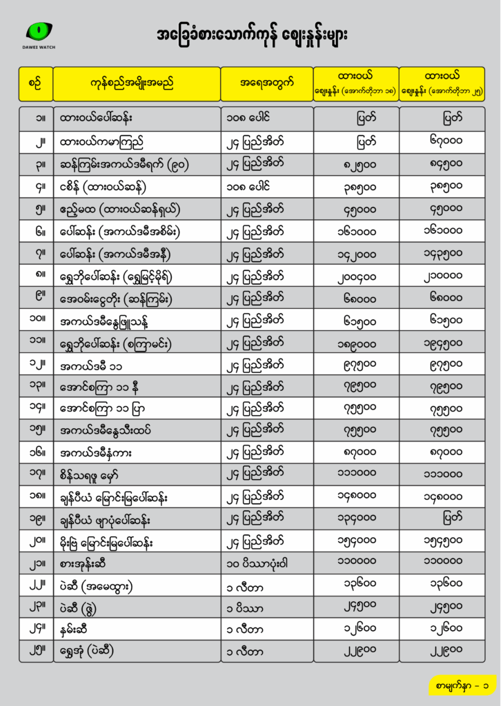 ကြက်သွန်နီ၊ ဆီနှင့် အခြားစာသုံးကုန်ပစ္စည်းများမှာ ဇယားပါဈေးနှုန်းများအတိုင်း ဈေးငြိမ်လျက်ရှိသည်။