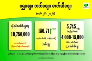 ရန်ကုန်ဈေးကွက်တွင် အခေါက်ရွှေတစ်ကျပ်သားလျှင် ၁၀,၅၂၀,၀၀၀ ကျပ် ဈေးဖွင့်ထားသည်။