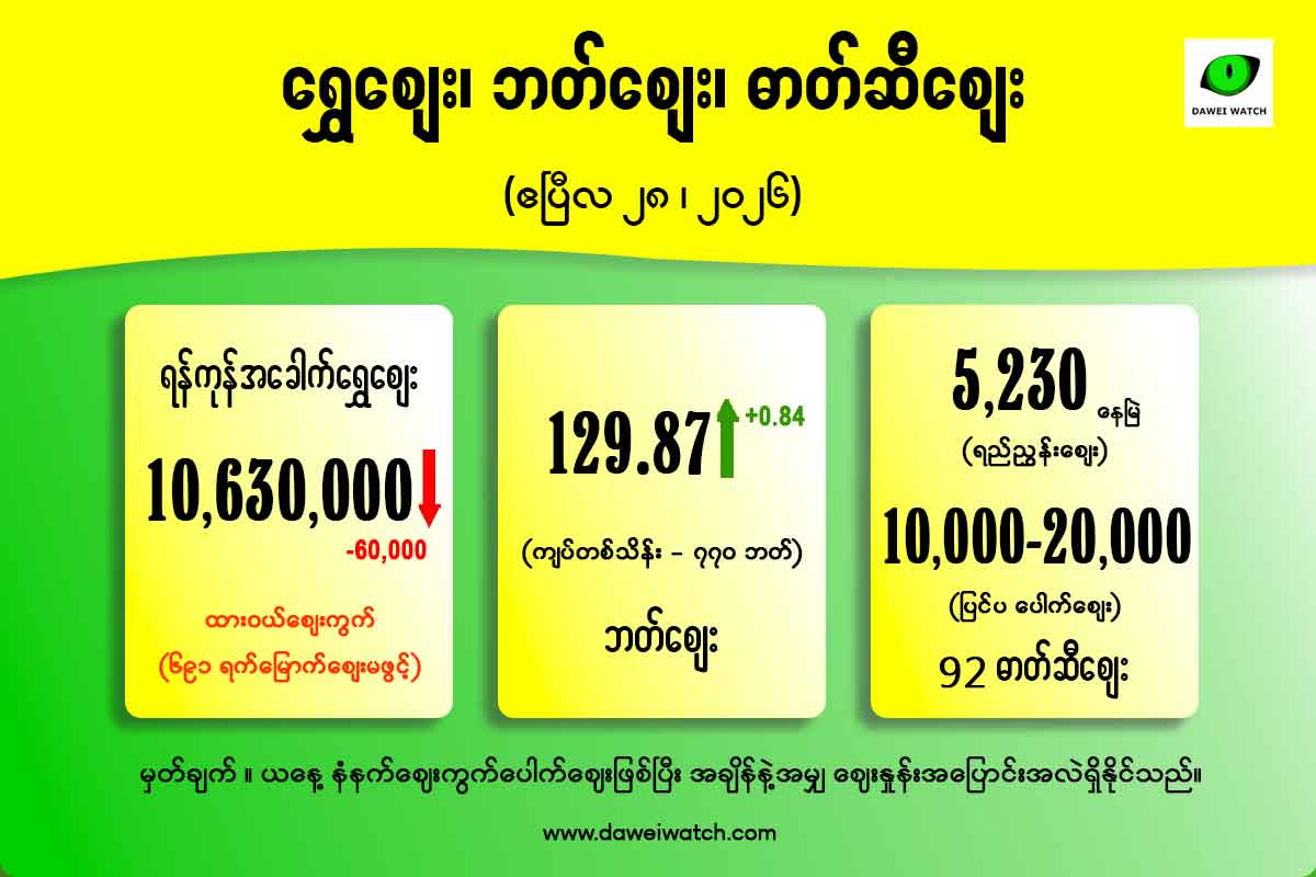ရန်ကုန်ဈေးကွက်တွင် အခေါက်ရွှေတစ်ကျပ်သားလျှင် 10630000 ကျပ် ဈေးဖွင့်ထားသည်။