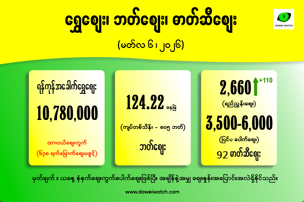 March 4, 2026ထားဝယ်ဈေးကွက်အတွင်း အခေါက်ရွှေဈေးမဖွင့်တော့သည်မှာ ရက် ၆၃၆ မြောက်ရှိလာပြီဖြစ်သည်။ စစ်ကော်မရှင် သတ်မှတ်ဈေးအတိုင်း မရောင်းပါက ဖမ်းဆီးပြီး ပိုင်ဆိုင်မှုကိုပါ သိမ်းဆည်းမည်ဟု ခြိမ်းခြောက်ထားသည့်အတွက် ၂၀၂၄ ခုနှစ် ဇွန်လ ၅ ရက်နေ့မှစကာ အခေါက်ရွှေဈေး မဖွင့်တော့ပေ။ ထိုကြောင့် ထားဝယ်ဈေးကွက်တွင် အခေါက်ရွှေဈေးမဖွင့်တော့ဘဲ ရန်ကုန်ဈေးကွက်ကို အခြေခံကာ ကြိုက်ရောင်းကြိုက်ဝယ် ဖြစ်နေသည်။ ရန်ကုန်ဈေးကွက်တွင် အခေါက်ရွှေတစ်ကျပ်သားလျှင် 10850000 ကျပ် ဈေးဖွင့်ထားသည်။ ထိုင်းဘတ်ငွေလဲနှုန်းမှာ ငြိမ်နေပြီး မြန်မာငွေတစ်သိန်းလျှင် 805 ဘတ် ဈေးဖွင့်ထားသည်။ ဓာတ်ဆီဈေးမှာ ရည်ညွှန်းဈေးနှုန်းအပြင် မြေပြင်တွင် အမှန်တစ်ကယ် ဝယ်ယူသုံးစွဲရသည့် ပြင်ပဈေးကွက်ပေါက်ဈေးကိုပါ ပူးတွဲဖော်ပြအပ်ပါသည်။