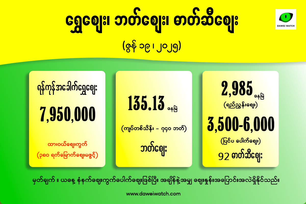 June 19, 2025ထားဝယ်ဈေးကွက်အတွင်း အခေါက်ရွှေဈေးမဖွင့်တော့သည်မှာ ၃၈၀ ရက်မြောက်ရှိလာပြီဖြစ်သည်။ စစ်ကောင်စီသတ်မှတ်ဈေးအတိုင်း မရောင်းပါက ဖမ်းဆီးပြီး ပိုင်ဆိုင်မှုကိုပါ သိမ်းဆည်းမည်ဟု ခြိမ်းခြောက်ထားသည့်အတွက် ဇွန်လ ၅ ရက်နေ့မှစကာ အခေါက်ရွှေဈေး မဖွင့်တော့ပေ။ ထိုကြောင့် ထားဝယ်ဈေးကွက်တွင် အခေါက်ရွှေဈေးမဖွင့်တော့ဘဲ ရန်ကုန်ဈေးကွက်ကို အခြေခံကာ ကြိုက်ရောင်းကြိုက်ဝယ် ဖြစ်နေသည်။ ရန်ကုန်ဈေးကွက်တွင် အခေါက်ရွှေတစ်ကျပ်သားလျှင် ၇,၉၅၀,၀၀၀ ကျပ် ဈေးဖွင့်ထားသည်။ ထိုင်းဘတ်ငွေလဲနှုန်းမှာ ဆက်တိုက်ငြိမ်နေပြီး မြန်မာငွေတစ်သိန်းလျှင် ၇၄၀ ဘတ် ဈေးဖွင့်ထားသည်။ ဓာတ်ဆီဈေးမှာ ရည်ညွှန်းဈေးနှုန်းအပြင် မြေပြင်တွင် အမှန်တစ်ကယ် ဝယ်ယူသုံးစွဲရသည့် ပြင်ပဈေးကွက်ပေါက်ဈေးကိုပါ ပူးတွဲဖော်ပြအပ်ပါသည်။