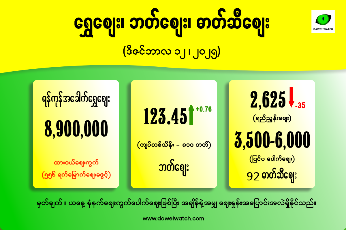 December 23, 2025ထားဝယ်ဈေးကွက်အတွင်း အခေါက်ရွှေဈေးမဖွင့်တော့သည်မှာ ၅၆၅ ရက်မြောက်ရှိလာပြီဖြစ်သည်။ စစ်ကော်မရှင် သတ်မှတ်ဈေးအတိုင်း မရောင်းပါက ဖမ်းဆီးပြီး ပိုင်ဆိုင်မှုကိုပါ သိမ်းဆည်းမည်ဟု ခြိမ်းခြောက်ထားသည့်အတွက် ဇွန်လ ၅ ရက်နေ့မှစကာ အခေါက်ရွှေဈေး မဖွင့်တော့ပေ။ ထိုကြောင့် ထားဝယ်ဈေးကွက်တွင် အခေါက်ရွှေဈေးမဖွင့်တော့ဘဲ ရန်ကုန်ဈေးကွက်ကို အခြေခံကာ ကြိုက်ရောင်းကြိုက်ဝယ် ဖြစ်နေသည်။ ရန်ကုန်ဈေးကွက်တွင် အခေါက်ရွှေတစ်ကျပ်သားလျှင် 9280000 ကျပ် ဈေးဖွင့်ထားသည်။ ထိုင်းဘတ်ငွေလဲနှုန်းမှာ တက်ရိပ်ပြလာပြီး မြန်မာငွေတစ်သိန်းလျှင် 805 ဘတ် ဈေးဖွင့်ထားသည်။ ဓာတ်ဆီဈေးမှာ ရည်ညွှန်းဈေးနှုန်းအပြင် မြေပြင်တွင် အမှန်တစ်ကယ် ဝယ်ယူသုံးစွဲရသည့် ပြင်ပဈေးကွက်ပေါက်ဈေးကိုပါ ပူးတွဲဖော်ပြအပ်ပါသည်။