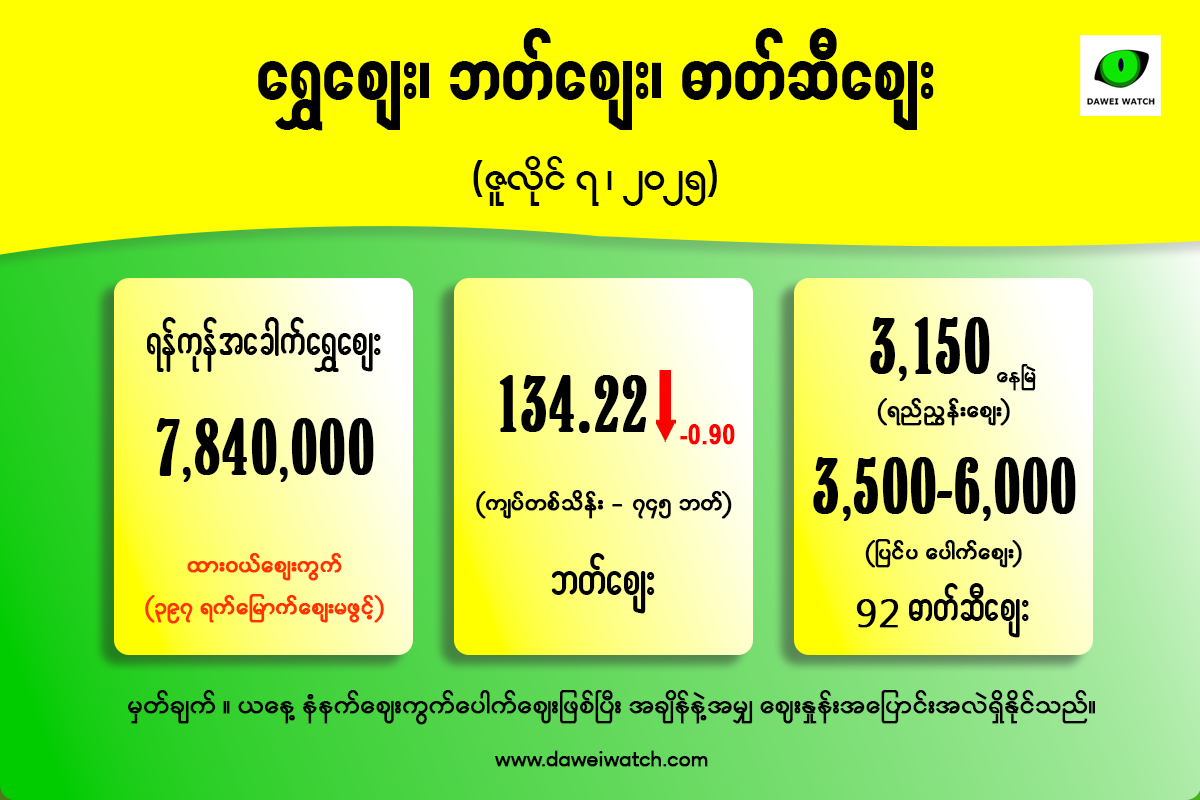 July 10, 2025ထားဝယ်ဈေးကွက်အတွင်း အခေါက်ရွှေဈေးမဖွင့်တော့သည်မှာ ရက် ၄၀၀ မြောက်ရှိလာပြီဖြစ်သည်။ စစ်ကောင်စီသတ်မှတ်ဈေးအတိုင်း မရောင်းပါက ဖမ်းဆီးပြီး ပိုင်ဆိုင်မှုကိုပါ သိမ်းဆည်းမည်ဟု ခြိမ်းခြောက်ထားသည့်အတွက် ဇွန်လ ၅ ရက်နေ့မှစကာ အခေါက်ရွှေဈေး မဖွင့်တော့ပေ။ ထိုကြောင့် ထားဝယ်ဈေးကွက်တွင် အခေါက်ရွှေဈေးမဖွင့်တော့ဘဲ ရန်ကုန်ဈေးကွက်ကို အခြေခံကာ ကြိုက်ရောင်းကြိုက်ဝယ် ဖြစ်နေသည်။ ရန်ကုန်ဈေးကွက်တွင် အခေါက်ရွှေတစ်ကျပ်သားလျှင် ၇,၈၂၀,၀၀၀ ကျပ် ဈေးဖွင့်ထားသည်။ ထိုင်းဘတ်ငွေလဲနှုန်းမှာ ဆက်ငြိမ်နေပြီး မြန်မာငွေတစ်သိန်းလျှင် ၇၄၅ ဘတ် ဈေးဖွင့်ထားသည်။ ဓာတ်ဆီဈေးမှာ ရည်ညွှန်းဈေးနှုန်းအပြင် မြေပြင်တွင် အမှန်တစ်ကယ် ဝယ်ယူသုံးစွဲရသည့် ပြင်ပဈေးကွက်ပေါက်ဈေးကိုပါ ပူးတွဲဖော်ပြအပ်ပါသည်။