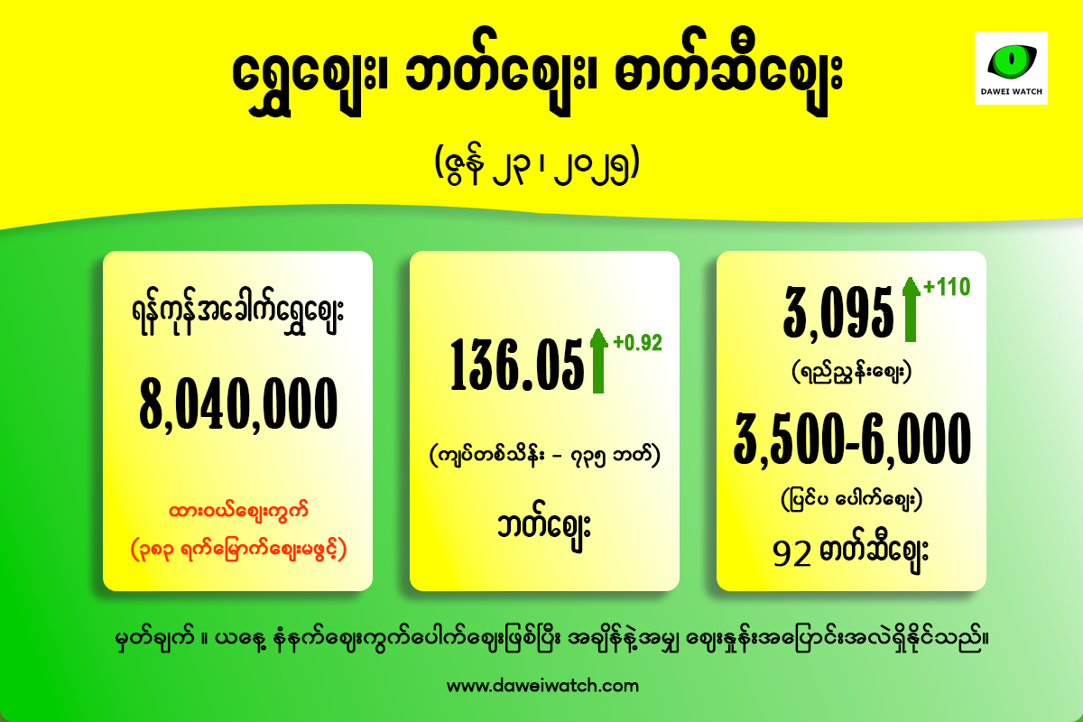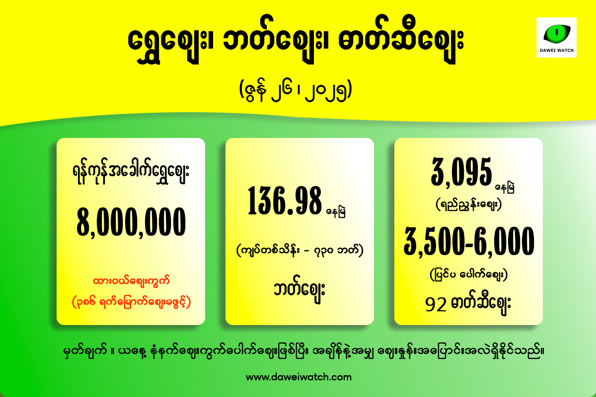 July 2, 2025ထားဝယ်ဈေးကွက်အတွင်း အခေါက်ရွှေဈေးမဖွင့်တော့သည်မှာ ၃၉၂ ရက်မြောက်ရှိလာပြီဖြစ်သည်။ စစ်ကောင်စီသတ်မှတ်ဈေးအတိုင်း မရောင်းပါက ဖမ်းဆီးပြီး ပိုင်ဆိုင်မှုကိုပါ သိမ်းဆည်းမည်ဟု ခြိမ်းခြောက်ထားသည့်အတွက် ဇွန်လ ၅ ရက်နေ့မှစကာ အခေါက်ရွှေဈေး မဖွင့်တော့ပေ။ ထိုကြောင့် ထားဝယ်ဈေးကွက်တွင် အခေါက်ရွှေဈေးမဖွင့်တော့ဘဲ ရန်ကုန်ဈေးကွက်ကို အခြေခံကာ ကြိုက်ရောင်းကြိုက်ဝယ် ဖြစ်နေသည်။ ရန်ကုန်ဈေးကွက်တွင် အခေါက်ရွှေတစ်ကျပ်သားလျှင် ၇,၉၁၀,၀၀၀ ကျပ် ဈေးဖွင့်ထားသည်။ ထိုင်းဘတ်ငွေလဲနှုန်းမှာ ကျရိပ်ဆက်ပြလာပြီး မြန်မာငွေတစ်သိန်းလျှင် ၇၄၀ ဘတ် ဈေးဖွင့်ထားသည်။ ဓာတ်ဆီဈေးမှာ ရည်ညွှန်းဈေးနှုန်းအပြင် မြေပြင်တွင် အမှန်တစ်ကယ် ဝယ်ယူသုံးစွဲရသည့် ပြင်ပဈေးကွက်ပေါက်ဈေးကိုပါ ပူးတွဲဖော်ပြအပ်ပါသည်။