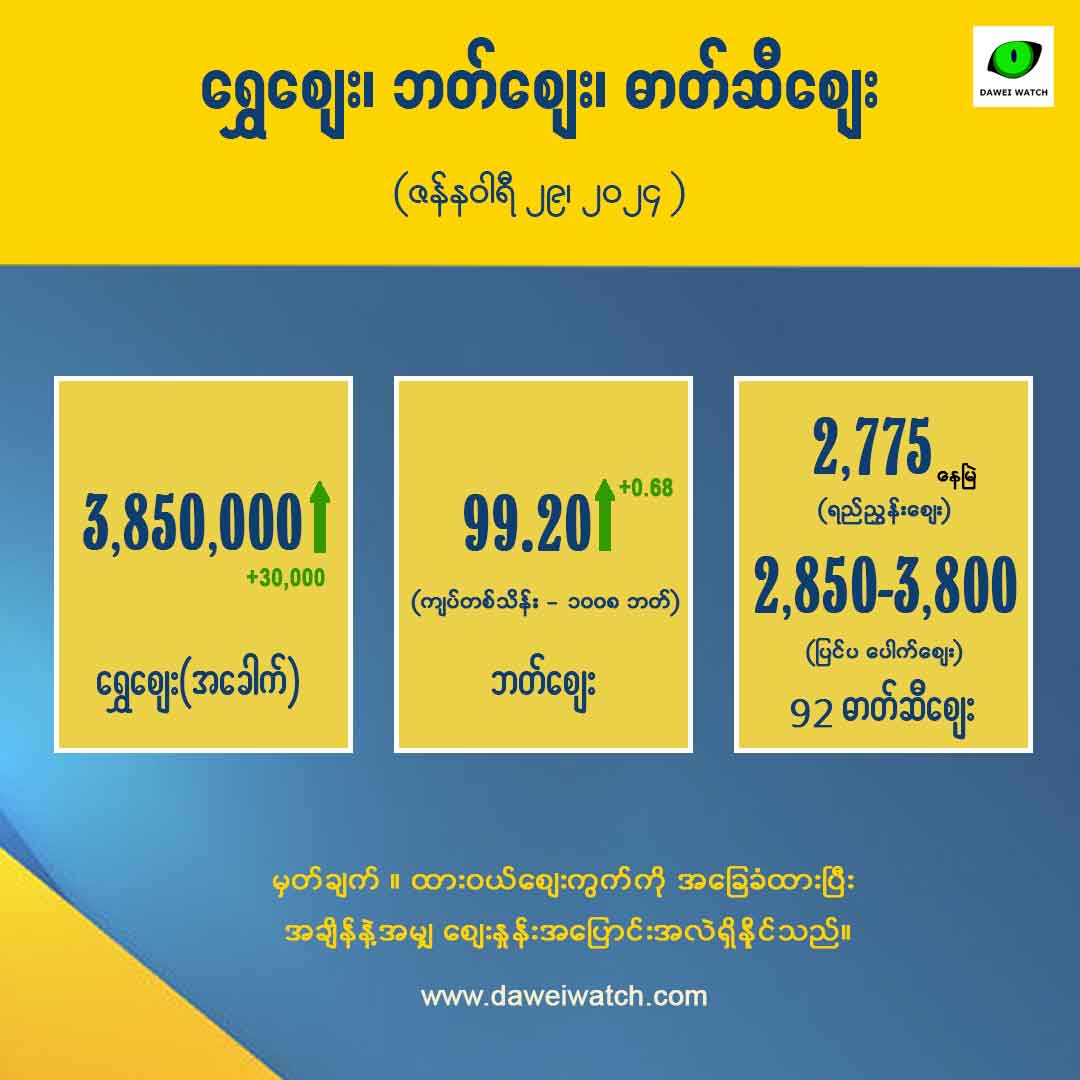 January 30, 2024ယမန်နေ့နှင့် ယနေ့ဈေးနှုန်း နှိုင်းယှဉ်ချက်အရအခေါက်ရွှေဈေးမှာ အပြောင်းအလဲမရှိ ငြိမ်နေသည်။ ထားဝယ်ဈေးကွက်အတွင်း အခေါက်ရွှေတစ်ကျပ်သားလျှင် (၃,၈၅၀,၀၀၀)သုံးဆယ့်ရှစ်သိန်းငါးသောင်းကျပ် ဈေးဖွင့်ထားသည်။ ထိုင်းဘတ်ဈေးမှာ တက်လာပြီး မြန်မာငွေတစ်သိန်းလျှင် ၁၀၀၂ ဘတ် ဈေးဖွင့်ထားသည်။ ဓာတ်ဆီဈေးမှာ ရည်ညွှန်းဈေးနှုန်းအပြင် မြေပြင်တွင် အမှန်တစ်ကယ် ဝယ်ယူသုံးစွဲရသည့် ပြင်ပဈေးကွက်ပေါက်ဈေးကိုပါ ပူးတွဲဖော်ပြအပ်ပါသည်။