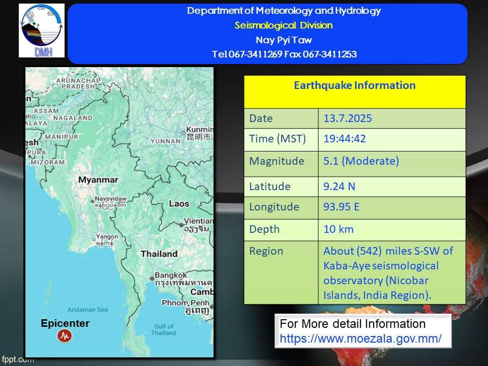 July 21, 2025တောင်တရုတ်ပင်လယ်ပြင်တွင် ဖြစ်ပေါ်နေသော အားကောင်းသော အပူပိုင်းမုန်တိုင်း ဝီဖာကြောင့် ထိုင်းနိုင်ငံမြောက်ပိုင်းနှင့် အလယ်ပိုင်းခရိုင်များတွင် ဇူလိုင်လ ၂၂ ရက် မှ ၂၄ ရက်အထိ မိုးအလွန်သည်းထန်စွာ ရွာသွန်းနိုင်ကြောင်း ဘေးအန္တရာယ် ကာကွယ်ရေးဦးစီးဌာန(DDPM) က သတိပေးထုတ်ပြန်လိုက်သည်။ မုန်တိုင်း၏အရှိန်ကြောင့် ထိုင်းမြောက်ပိုင်းရှိ နန်း၊ ဖယောင်၊ ချင်းရိုင်၊ လမ်ဖွန်၊ လမ်ပန်၊ ဖရဲ၊ ဥထရာဒစ်၊ ချင်းမိုင်၊ မယ်ဟောင်ဆောင်၊ တာ့ခ်၊ နောင်ခိုင်၊ ဘွန်ကန်၊ နခွန်ဖနွန်၊ စကွန်နခွန်၊ နောင်ဘူလမ်ဖူ၊ လိုးအီ၊ ဥဒွန်းဌာနီ၊ ကန်ချနဘူရီ၊ ရတ်ချ်ဘူရီ၊ ဥထိုင်းဌာနီ၊ ချန်ထဘူရီ၊ တရတ် ခရိုင်များတွင် မိုးအလွန်သည်းထန်စွာ ရွာသွန်းနိုင်ကြောင်း သတိပေးထားသည်။ ယင်းခရိုင်များတွင် မိုးသည်းထန်မှုနှင့်အတူ ရုတ်တရက် ရေကြီးခြင်း၊ မြစ်ရေလျှံခြင်း၊ သစ်ပင်လဲခြင်းနှင့် မြေပြိုခြင်းများလည်း ဖြစ်ပေါ်လာနိုင်သဖြင့် […]