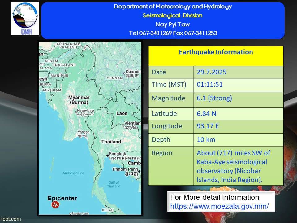 ကပ္ပလီပင်လယ်ပြင်ရှိ နီကိုဘားကျွန်း (အိန္ဒိယဧရိယာ) အနီး၌ ယနေ့ ဇူလိုင်လ ၂၉ ရက် နံနက်တွင် အင်အားပြင်းငလျင် လှုပ်ခတ်ကြောင်း မိုးလေဝသနှင့် ဇလဗေဒညွှန်ကြားမှုဦးစီးဌာနက ထုတ်ပြန်သည်။ နံနက် ၁ နာရီ ၁၁ မိနစ်တွင် ကမ္ဘာအေးမြေငလျင်စခန်း၏ အနောက်တောင်ဘက် ၇၁၇မိုင်ခန့်ကွာဝေးသောနေရာ၌ အနက် ၁၀ ကီလိုမီတာခန့်ကို ဗဟိုပြုလှုပ်ခတ်ပြီး အင်အားရစ်(ခ်)တာစကေး ၆ ဒသမ ၁ အဆင့်ရှိကြောင်း ဖော်ပြသည်။ ငလျင်လှုပ်ခတ်သည့်နေရာသည် ကော့သောင်းမြို့ နှင့် ရေမိုင် ၅၀၀ ခန့်အကွာတွင် တည်ရှိသည်။ ပြီးခဲ့သည့် ဇွန်လနောက်ဆုံးအပတ်နှင့် ဇူလိုင်လ ၁၄ ရက်တို့တွင်လည်း နီကိုဘားကျွန်းအနီးတစ်ဝိုက်တွင် ပြင်းအား ၄ ဒသမ ၇ နှင့် ၅ ဒသမ ၁ ရစ်ခ်တာစကေး အင်အားအသင့်အတင့်ရှိ […]